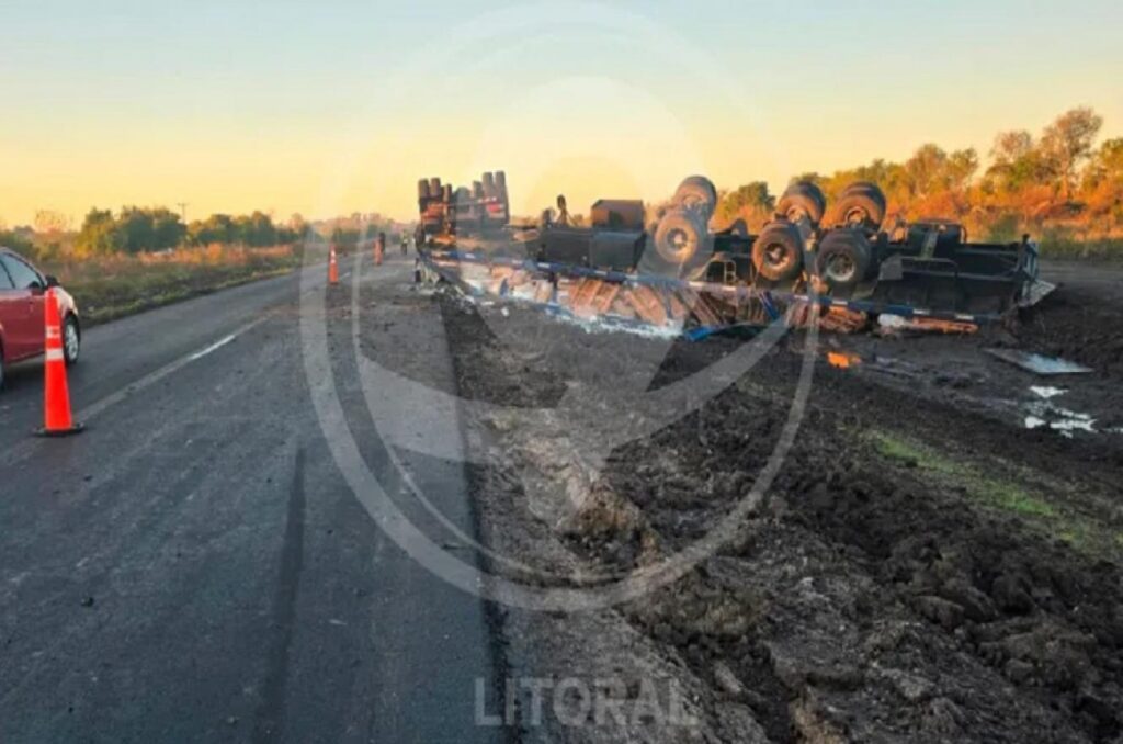 El camión se volcó por completo en la banquina, dispersando su carga a un lado de la vía. Según informó Canal 9 Litoral, el rodado llevaba suero para la fabricación de suplementos alimentarios para animales.