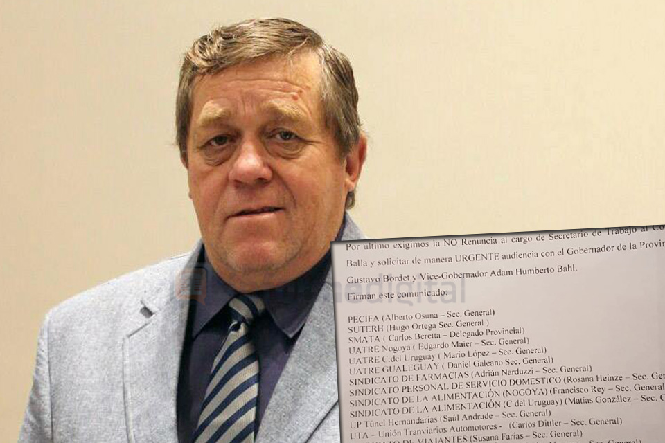 Creció el apoyo al secretario de Trabajo de la provincia por parte de entidades gremiales. Unos 20 secretarios generales firmaron una carta en la que exigen su “no renuncia” y piden que los reciban Bordet y Bahl. Sugieren movida política.