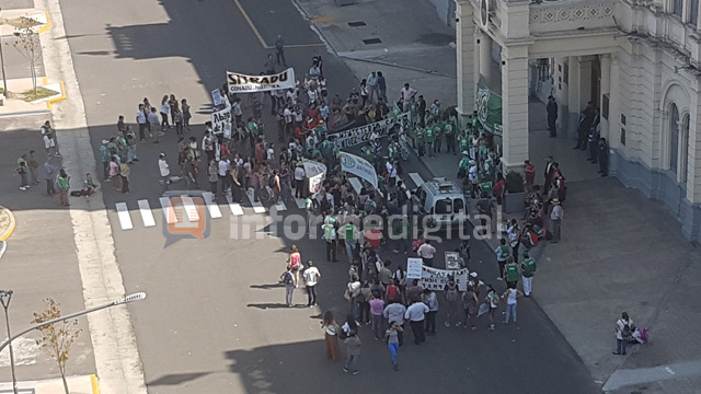 La protesta se inscribió en otras acciones que buscan romper los techos salariales impuestos por Nación. En la explanada de Casa de Gobierno, convocaron a la unidad para mejorar los salarios y convenios paritarios.