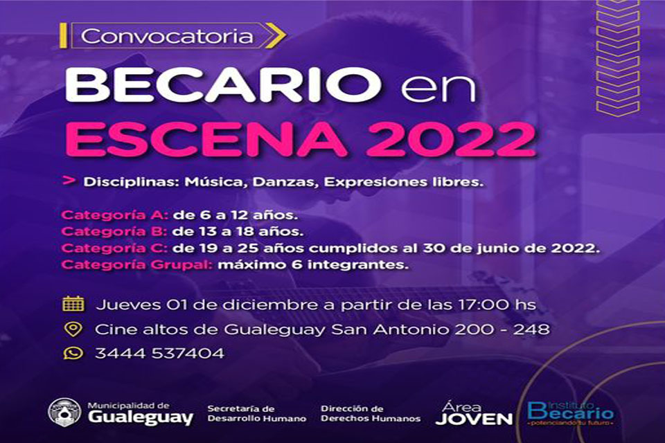 La convocatoria será el día jueves 1 de diciembre en Cine altos de Gualeguay a partir de las 17h. Si estás interesado en participar deberás leer el reglamento a través del link https://www.institutobecario.gov.ar/reglamentobecarioenes, y completar la ficha de inscripción que solicitan en la oficina del Área Joven o pueden comunicarse al 15-537404.