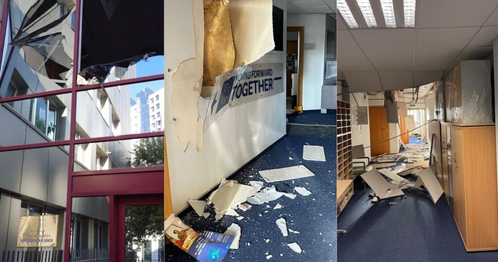 La comisaria europea de Ampliación, Marta Kos, informó que la sede de la misión fue impactada por la onda expansiva de los misiles y publicó imágenes en la red X.