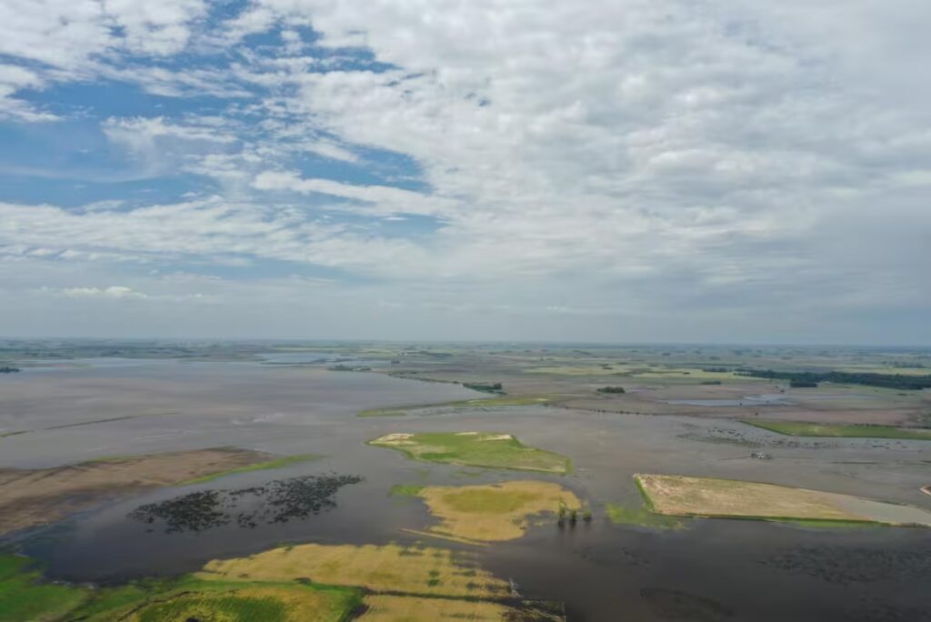 En este marco, Iturriaga conoce el tema de primera mano: es uno de los productores más afectados y tiene su campo en la Cuenca del Salado, justo en el tramo donde aún faltan 32 kilómetros pendientes del plan de desagüe, lo que funciona como un cuello de botella y prolonga la permanencia del agua en la zona. En sus lotes hoy el agua le llega a la cintura, en sectores que el año pasado sembró y cosechó sin problemas.