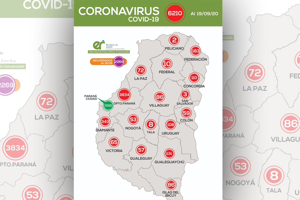 El ministerio de Salud dio a conocer la cantidad de pacientes dados de alta en la provincia hasta este sábado, que son 2.269. De esos, son 1.413 en el departamento Paraná y 514 en Gualeguaychú. El total de contagios ha sido de 6.210.