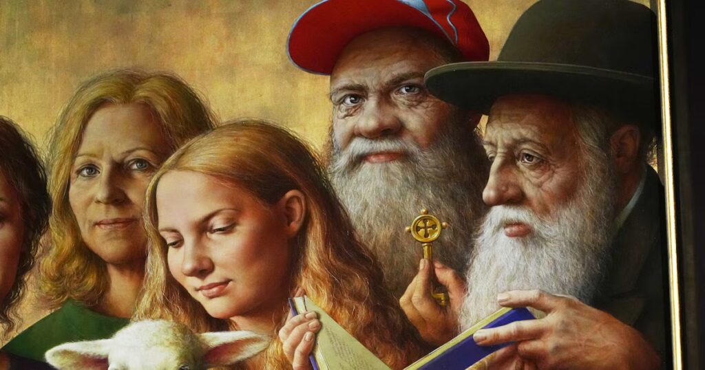 El hombre se convirtió en su San Pedro, ubicado entre los santos reunidos alrededor de María y el niño Jesús. Triegel dijo que era importante que sus personajes no fueran arquetipos idealizados, sino figuras que el espectador sintiera como personas “que podrían tener algo que ver conmigo aquí y ahora, que no son solo históricos”.