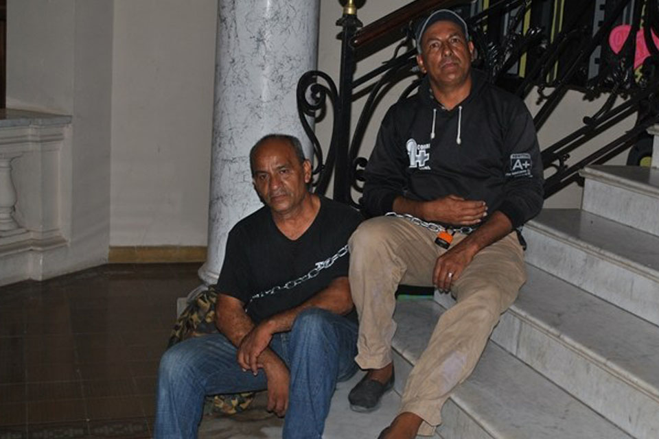 Bello Stefano. Ante la negativa para reincorporarlos, este lunes decidieron encadenarse en el interior del edificio comunal. Denuncian que sufrieron persecución ideológica por ser peronistas.