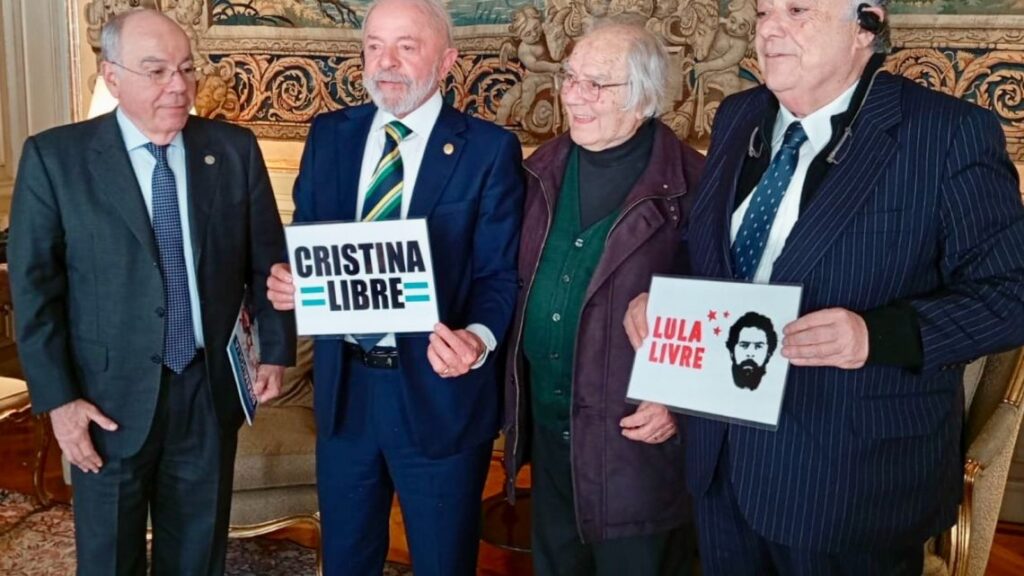 Valdés posó para una fotografía con el cartel “Cristina Libre”, acompañado por el presidente de Brasil, Lula da Silva, el Nobel de la Paz Adolfo Pérez Esquivel y el canciller brasileño Mauro Vieira.