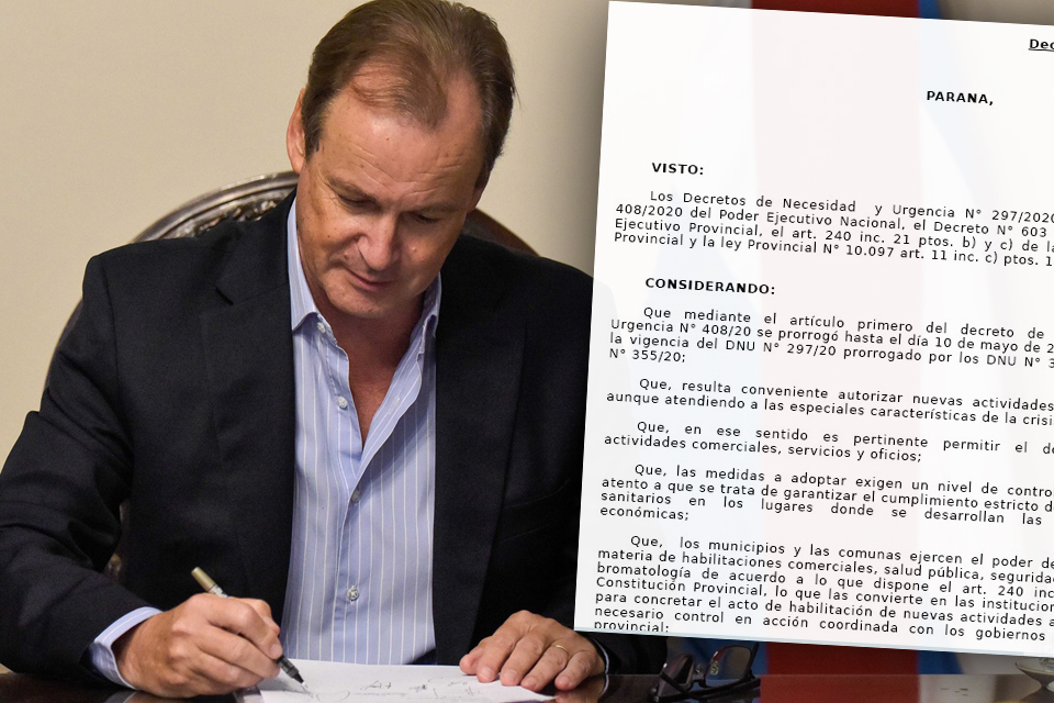 El gobierno provincial tiene listo para la firma de Gustavo Bordet el decreto que oficializa el anuncio que el gobernador realizó este lunes en la conferencia de prensa diaria en la Casa Gris, a partir del cual en toda la provincia podrán habilitarse comercios minoristas y oficios, bajo el control de los respectivos municipios.