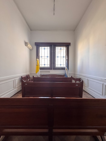 Como consta en la foto, se dispusieron tres bancos idénticos a los que suele verse en algunos pasillos de la Cámara alta y se ubicaron enfrentados a un mini estrado. A los lados del mismo se colocaron dos banderas: la argentina y una amarilla y blanca similar a las que utiliza la iglesia católica. Allí podrán asistir los senadores que profesen dicha religión para reflexionar, orar y pedir por el tratamiento de leyes. En el ex despacho de Kueider.