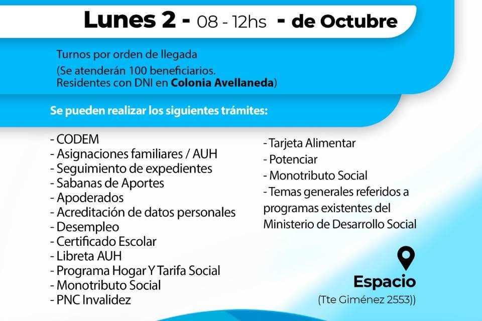 El municipio de Colonia Avellaneda informó que ANSES móvil llegará nuevamente a la ciudad: será el próximo lunes 2 de octubre.en Colonia Avellaneda.