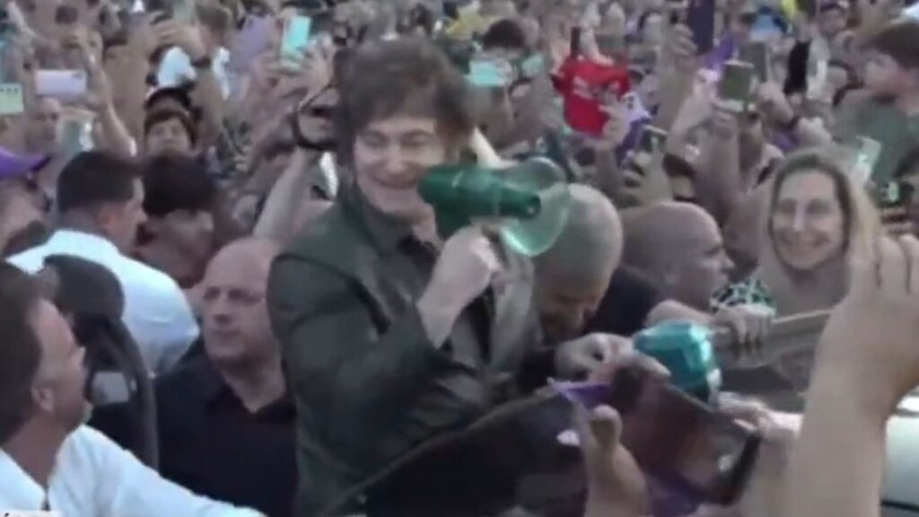 El Presidente habló desde la caja de la camioneta en la que se movilizaba junto a Karina Milei, Rogelio Frigerio y Joaquín Benegas Lynch, el candidato a senador nacional libertario por Entre Ríos.