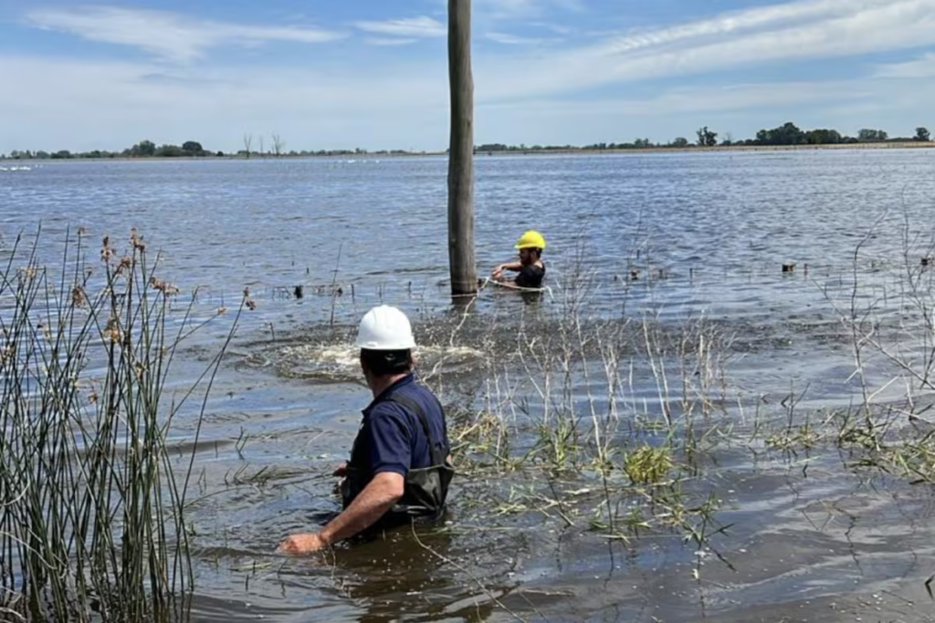 Trabajadores de la Cooperativa eléctrica local realizan tareas en medio del agua