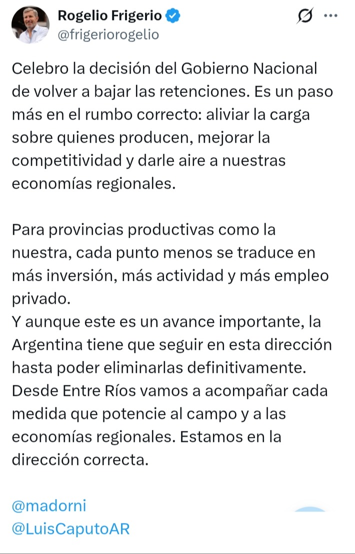 En esta misma línea se pronunció el gobernador de Entre Ríos, Rogelio Frigerio, quien también se mostró conforme con la normativa anunciada por el Ejecutivo nacional y así lo expresó en sus redes sociales, destacando que la medida alivia la carga sobre los productores, mejora la competitividad y beneficia especialmente a las economías regionales.