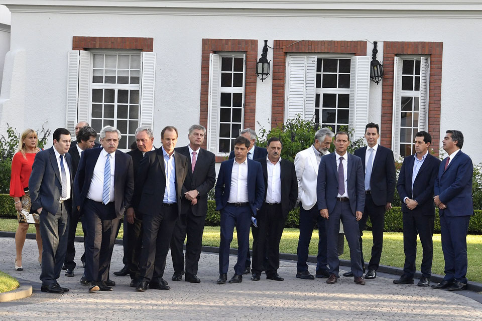 Axel Kicillof (Buenos Aires), Raúl Jalil (Catamarca), Jorge Capitanich (Chaco), Mariano Arcioni (Chubut), Gustavo Bordet (Entre Ríos), Gildo lnsfrán (Formosa), Sergio Ziliotto (La Pampa), Ricardo Quintela (La Rioja), Oscar Herrera Ahuad (Misiones), Omar Gutiérrez (Neuquén), Arabela Carreras (Río Negro), Gustavo Sáenz (Salta), Sergio Uñac (San Juan), Alberto Rodríguez Saá (San Luis), Alicia Kirchner (Santa Cruz), Omar Perotti (Santa Fe), Gerardo Zamora (Santiago del Estero), Gustavo Melella (Tierra del Fuego. Antártida e Islas del Atlántico Sur), y Juan Manzur (Tucumán).
