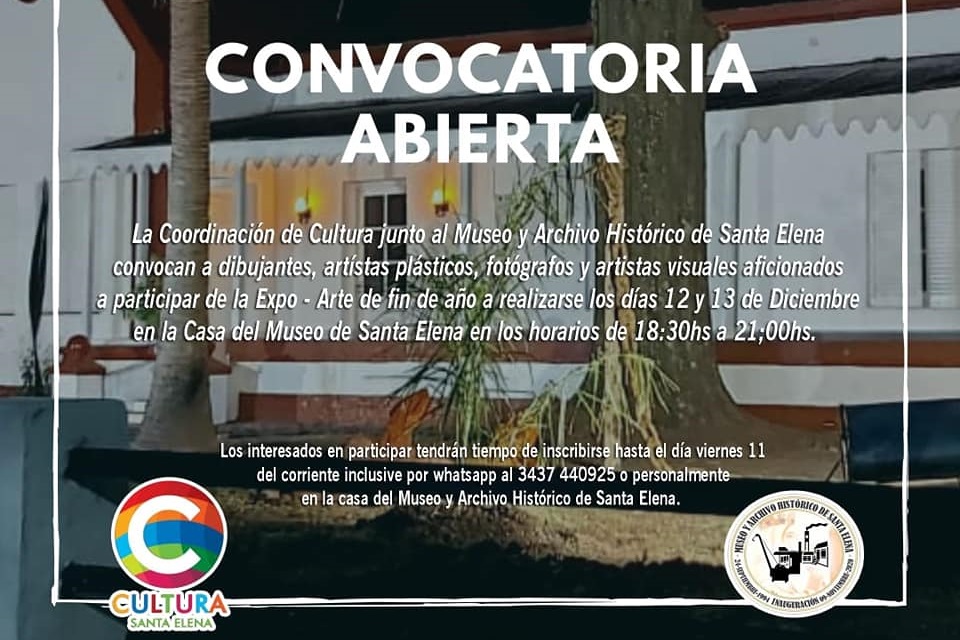 El Museo y Archivo Histórico de Santa Elena abre sus puertas a una propuesta conjunta con la Coordinación de Cultura de la Municipalidad de Santa Elena y el artista local Ariel Aloy, al que se denominó EXPO – ARTE. Este espacio dedicado y destinado a dibujantes, artistas plásticos y visuales, fotógrafos y también para aficionados, se realizará los días 12 y 13 de diciembre venideros, de 19 a 21 horas. La convocatoria está abierta hasta el próximo 11 de diciembre, inclusive.