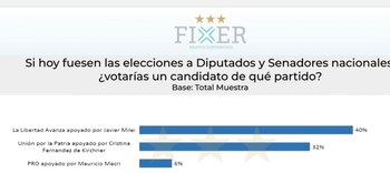 De acuerdo con una reciente encuesta realizada por la consultora Fixer, el escenario político de las elecciones legislativas nacionales evidencia un claro predominio del oficialismo. A menos de cuatro meses de los comicios, La Libertad Avanza (LLA) encabeza la intención de voto con un 40%. En un segundo lugar se encuentra Unión por la Patria, que cuenta con un 32% de las preferencias de los encuestados.
