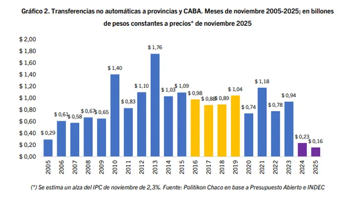 En noviembre, si se toma el acumulado del año de los fondos “discrecionales”, es decir, transferencias no automáticas que van por fuera de la coparticipación, se registró un desplome histórico: en el período se han mandado solo $2,2 billones, cifra que es la segunda más baja desde 2005, señala la consultora Politikon Chaco.