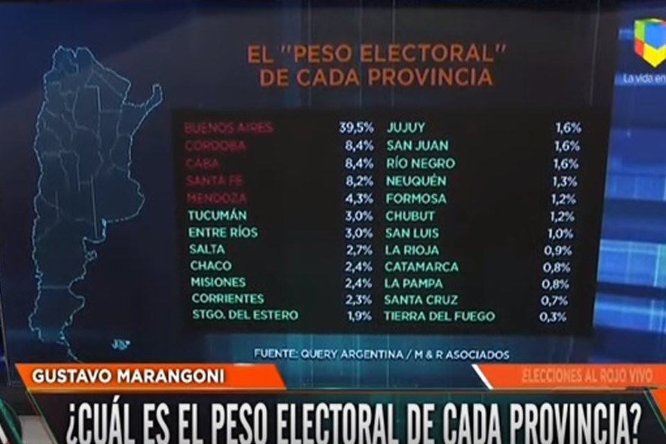 Luego indicó que a la cabeza del ranking de distritos con mayor peso electoral se encuentran Buenos Aires (39,5), Córdoba (8,4), Ciudad de Buenos Aires (8,4), Santa Fe (8,2%), y Mendoza (4,3%).
