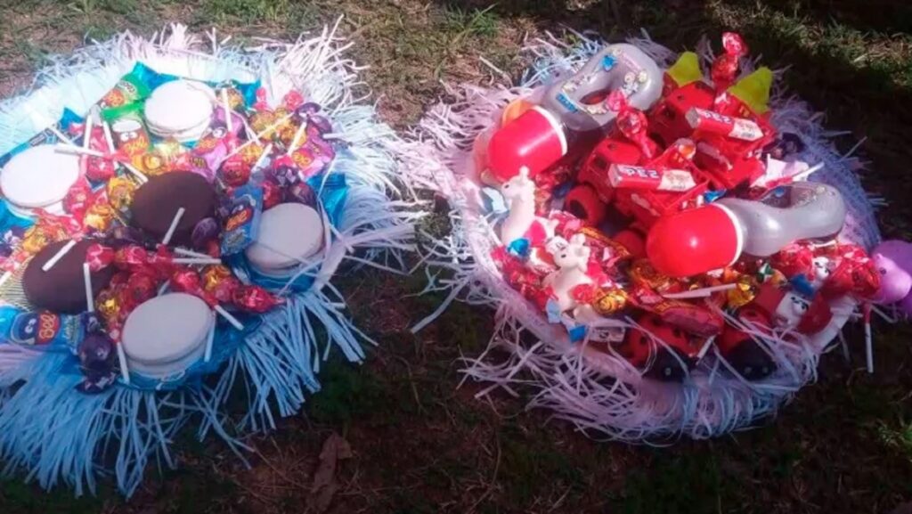 Un peculiar hallazgo ha generado inquietud entre los habitantes del barrio San Miguel Segundo de Concordia, donde fueron descubiertos dos canastos repletos de golosinas y juguetes para pequeños. Esta ofrenda ritual, que incluía mamaderas de bebé y chupetes, ha suscitado preocupación en la comunidad.