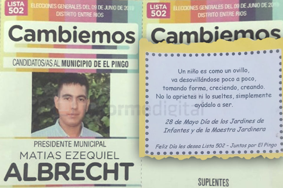 Ocurrió en El Pingo, departamento Paraná. Se viralizaron fotos de tarjetas que la lista local de Cambiemos, “Juntos por El Pingo”, habría repartido junto con dulces en escuelas a niños y maestras con la excusa del Día de los Jardines.