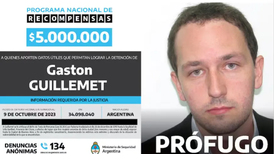 Para los detectives judiciales que lo buscan, es el prófugo más buscado. Hace 23 meses, poco después de asumir como ministra de Seguridad del gobierno de Javier Milei, Patricia Bullrich ofreció una recompensa de $5.000.000 para quien aporte datos que permitan la ubicación y detención de Gastón Guillemet. Sin embargo, el empresario todavía no fue capturado. Tiene una orden de captura nacional e internacional en una causa por trata de personas: lo acusan de atraer a adolescentes y jóvenes con promesas laborales para luego prostituirlas. Las víctimas tenían 14, 17 y 19 años.