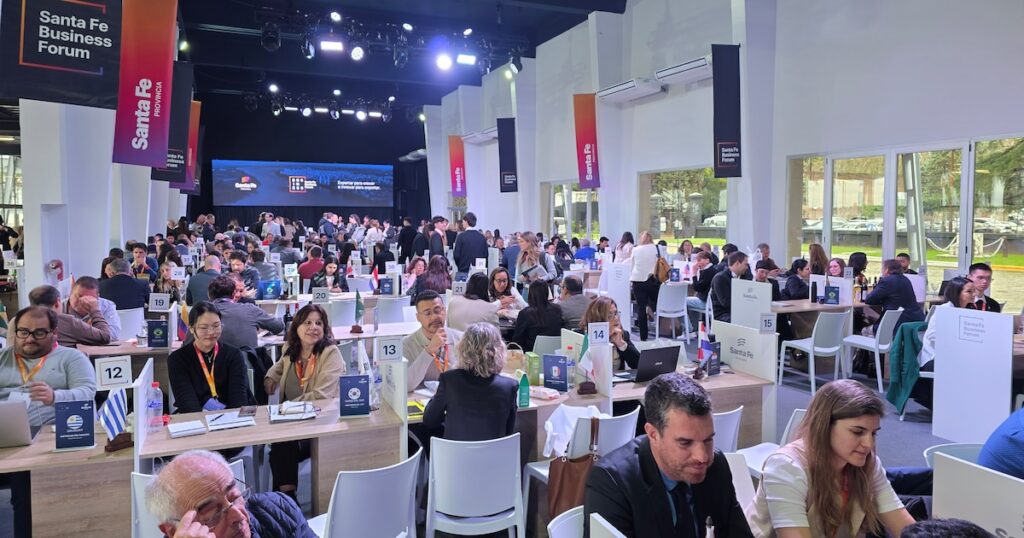 Las charlas, que se llevan a cabo en La Fluvial Rosario, en la zona portuaria de la ciudad, junto al Paraná, son vibrantes y globales. Se percibe el entusiasmo: la finalidad es concretar negocios y el sistema funciona. Cada una de las más de 100 mesas está decorada con banderas de más de 80 países que han llegado a Argentina para participar en esta ronda comercial inversa: en lugar de viajar a otro país para “vender” la provincia, Santa Fe ha traído a más de 250 compradores de 45 naciones para presentarles los productos regionales y cerrar acuerdos comerciales. Además, se suman más de 1.000 empresas argentinas interesadas en vender y 30 fondos de inversión, distribuidos en espacios que buscan activar negocios y fomentar el diálogo entre diferentes sectores.