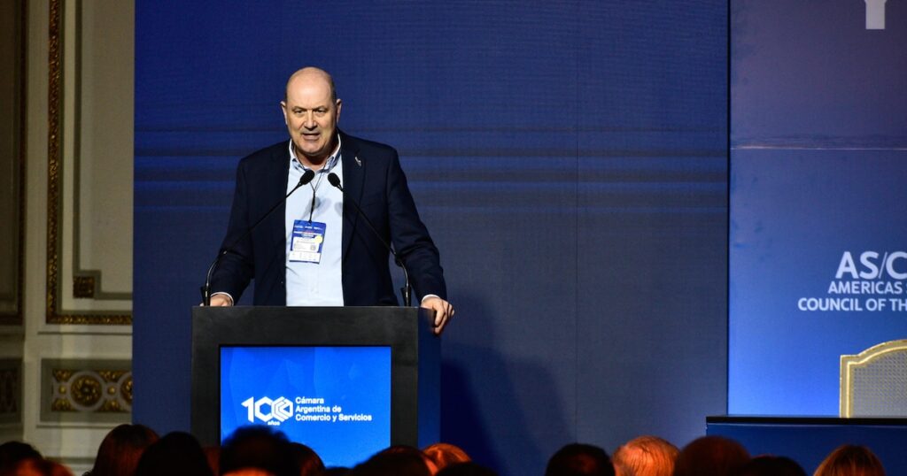 El ministro de Desregulación, Federico Sturzenegger, y el presidente de la Cámara Argentina de Comercio (CAC), Mario Grinman, vivieron un tenso momento durante el discurso del funcionario, quien pidió, frente a todo el auditorio, que se retirara una cautelar ante la Justicia relacionada con una medida adoptada meses atrás que prohibía el cobro de un aporte obligatorio por parte de las cámaras comerciales.