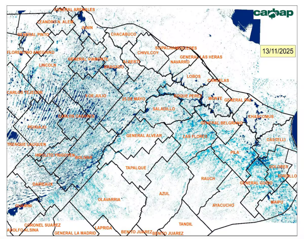 Imágenes satelitales muestran que 2 millones de hectáreas están bajo agua y 3,8 millones no se pueden sembrar; Carbap responsabiliza a intendentes, provincia de Buenos Aires y Nación por la falta de infraestructura. Carbap